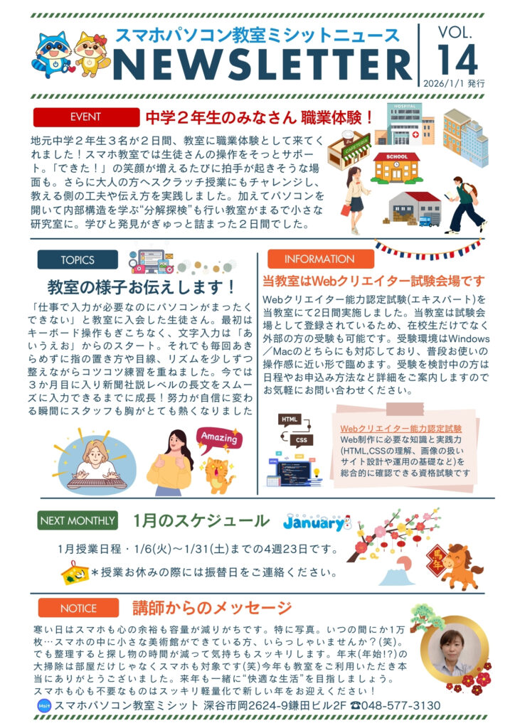 2026.02.13 ミシットニュースレター かおる先生 ニュースレターNo.14 Post Share Hatena Pocket RSS feedly Pin it ■1月の開校日について 1月の開校日:1/6(火)~1/31(土) ※授業お休みの際には振替日をご連絡ください。 ■駐車場のご案内 教室用駐車場は2か所ございます。講師も利用しますので満車の場合にはご連絡ください。別駐車場をご案内いたします。 ■口コミ評価してくれたら喜びます! 今、通学中の生徒さん、ご卒業された生徒さん、ぜひぜひ口コミをお寄せください!スタッフの励みになります。口コミ、もっと欲しい~(笑)お菓子、もっと充実させちゃうかも? 「深谷市 パソコン教室」と検索してから評価してください。 Post Share Hatena Pocket RSS feedly Pin it